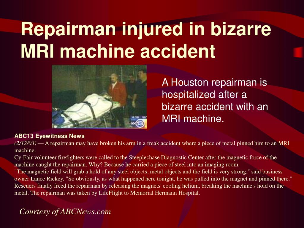 Repairman injured in bizarre MRI machine accident A Houston repairman is hospitalized after a bizarre accident with an MRI machine. ABC13 Eyewitness News(2/12/03) — A repairman may have broken his arm in a freak accident where a piece of metal pinned him to an MRI machine. Cy-Fair volunteer firefighters were called to the Steeplechase Diagnostic Center after the magnetic force of the machine caught the repairman. Why? Because he carried a piece of steel into an imaging room. "The magnetic field will grab a hold of any steel objects, metal objects and the field is very strong," said business owner Lance Rickey. "So obviously, as what happened here tonight, he was pulled into the magnet and pinned there." Rescuers finally freed the repairman by releasing the magnets' cooling helium, breaking the machine's hold on the metal. The repairman was taken by LifeFlight to Memorial Hermann Hospital. Courtesy of ABCNews.com