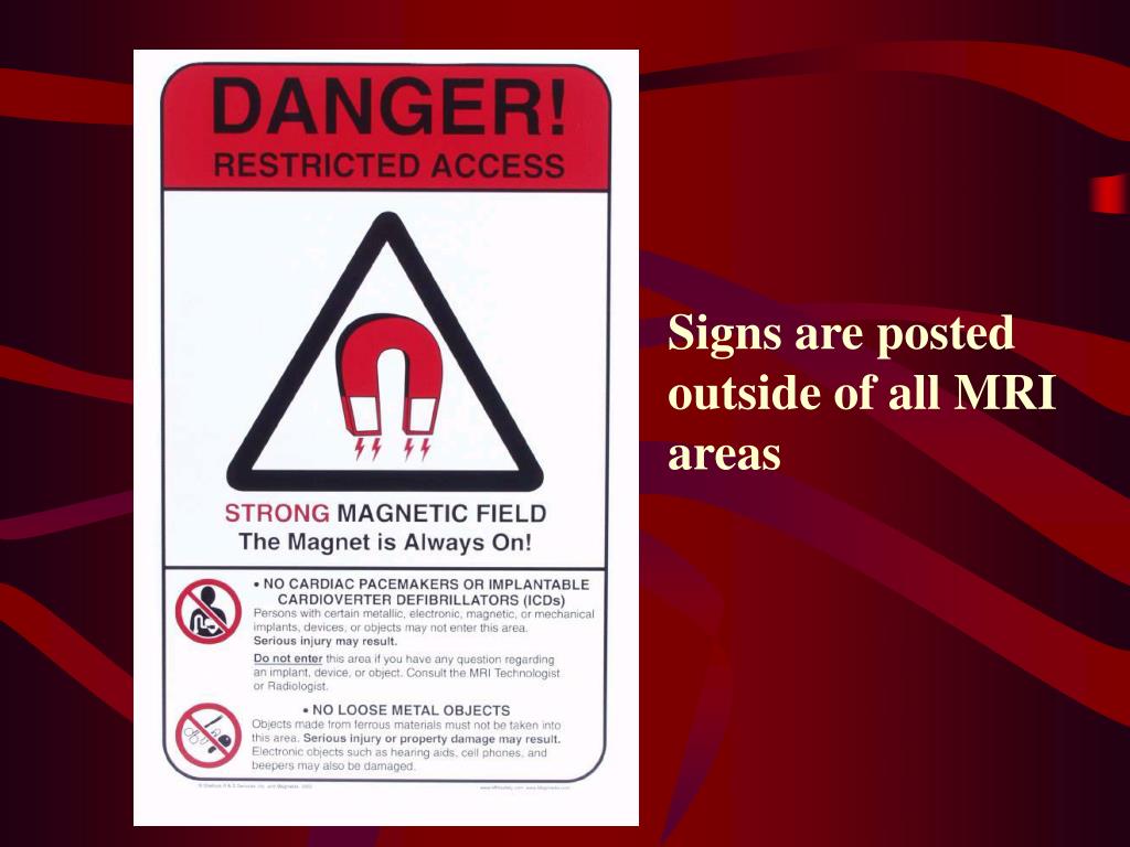 Precautions for PeopleEntering the Magnet Room • Pregnant Employees • Women that are pregnant, or suspect that they may be pregnant, should not go in the restricted area during the first trimester. • After the first trimester, they can go near the magnet but should not stay in the room during imaging procedures.