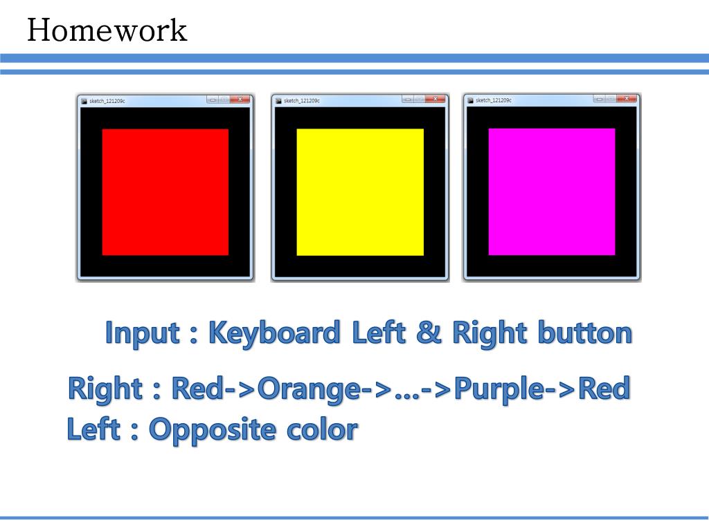 Homework Input : Keyboard Left & Right button Right : Red->Orange->…->Purple->Red Left : Opposite color