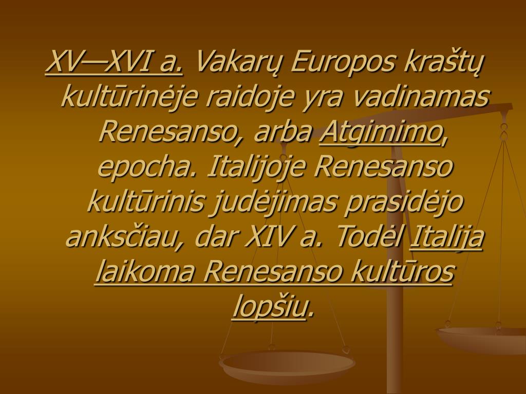 XV—XVI a.Vakarų Europos kraštų kultūrinėje raidoje yra vadinamas Renesanso, arbaAtgimimo, epocha. Italijoje Renesanso kultūrinis judėjimas prasidėjo anksčiau, dar XIV a. TodėlItalijalaikoma Renesanso kultūros lopšiu.