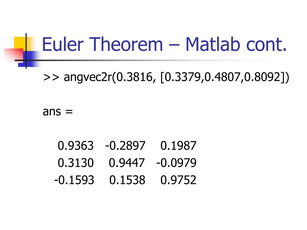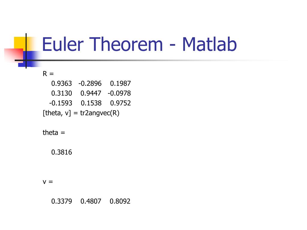 Euler Theorem – Matlab cont. >> angvec2r(0.3816, [0.3379,0.4807,0.8092]) ans = 0.9363 -0.2897 0.1987 0.3130 0.9447 -0.0979 -0.1593 0.1538 0.9752