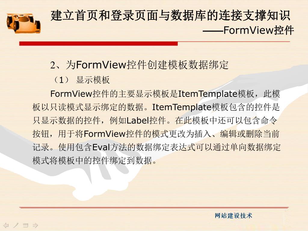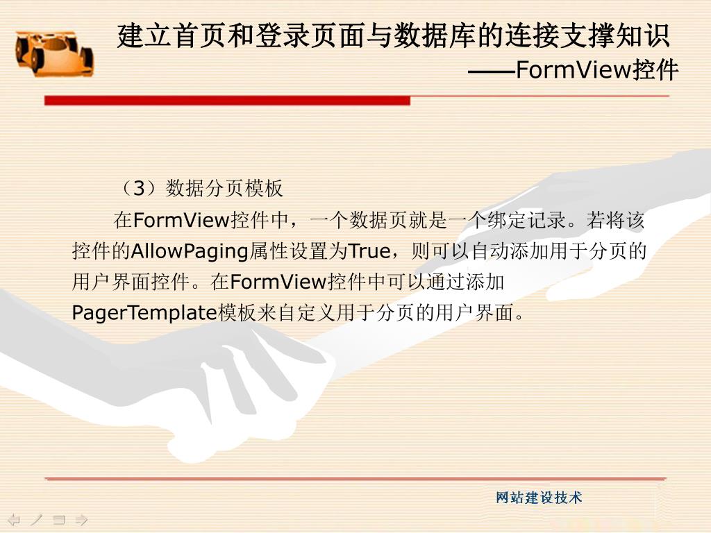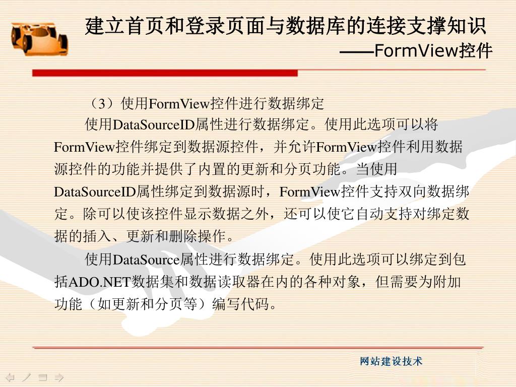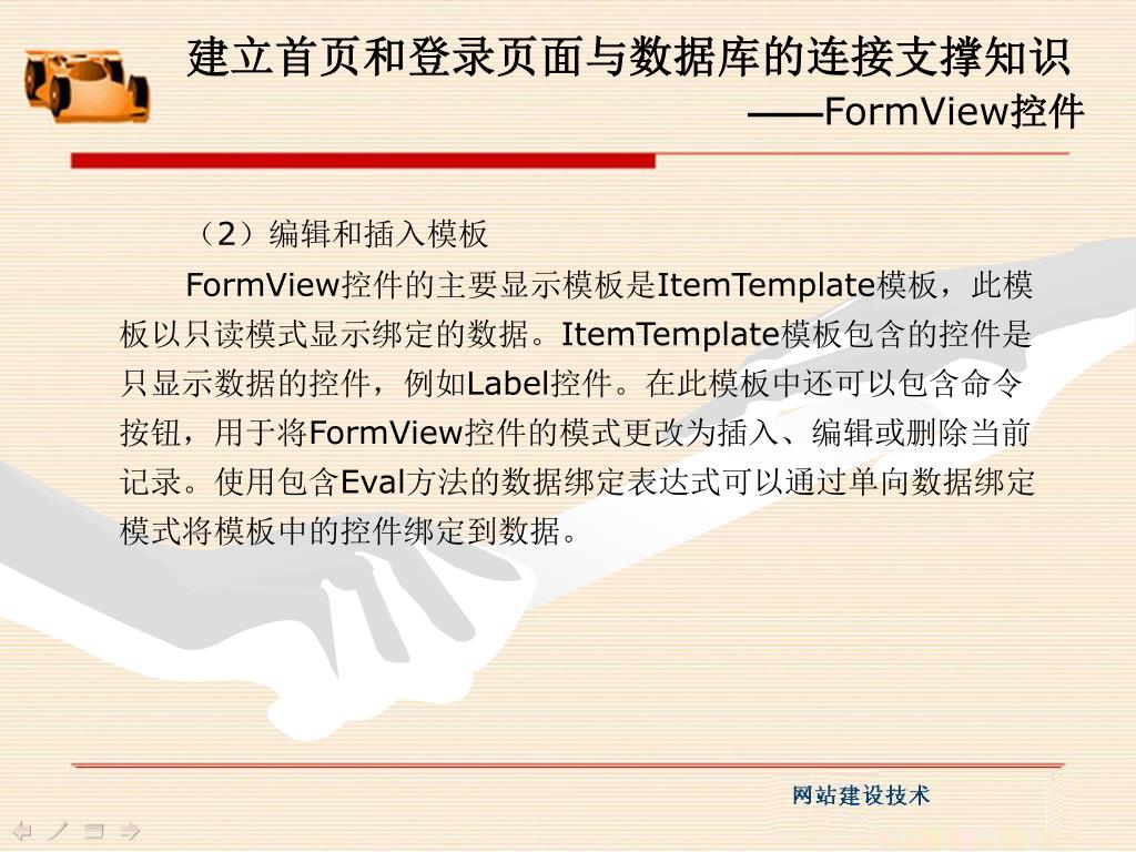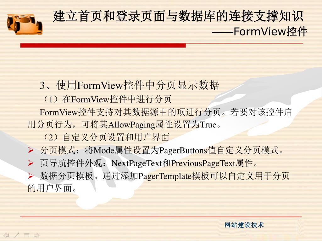 建立首页和登录页面与数据库的连接支撑知识——FormView控件建立首页和登录页面与数据库的连接支撑知识——FormView控件 3、使用FormView控件中分页显示数据 (1)在FormView控件中进行分页 FormView控件支持对其数据源中的项进行分页。若要对该控件启用分页行为,可将其AllowPaging属性设置为True。 (2)自定义分页设置和用户界面 • 分页模式:将Mode属性设置为PagerButtons值自定义分页模式。 • 页导航控件外观:NextPageText和PreviousPageText属性。 • 数据分页模板。通过添加PagerTemplate模板可以自定义用于分页的用户界面。