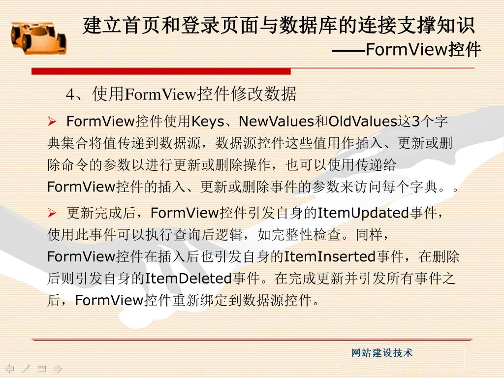 建立首页和登录页面与数据库的连接支撑知识——FormView控件建立首页和登录页面与数据库的连接支撑知识——FormView控件 4、使用FormView控件修改数据 • FormView控件使用Keys、NewValues和OldValues这3个字典集合将值传递到数据源,数据源控件这些值用作插入、更新或删除命令的参数以进行更新或删除操作,也可以使用传递给FormView控件的插入、更新或删除事件的参数来访问每个字典。。 • 更新完成后,FormView控件引发自身的ItemUpdated事件,使用此事件可以执行查询后逻辑,如完整性检查。同样,FormView控件在插入后也引发自身的ItemInserted事件,在删除后则引发自身的ItemDeleted事件。在完成更新并引发所有事件之后,FormView控件重新绑定到数据源控件。