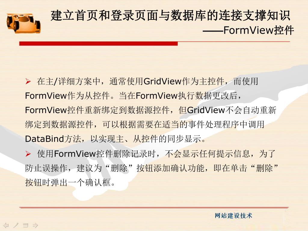 建立首页和登录页面与数据库的连接支撑知识——FormView控件建立首页和登录页面与数据库的连接支撑知识——FormView控件 • 在主/详细方案中,通常使用GridView作为主控件,而使用FormView作为从控件。当在FormView执行数据更改后,FormView控件重新绑定到数据源控件,但GridView不会自动重新绑定到数据源控件,可以根据需要在适当的事件处理程序中调用DataBind方法,以实现主、从控件的同步显示。 • 使用FormView控件删除记录时,不会显示任何提示信息,为了防止误操作,建议为“删除”按钮添加确认功能,即在单击“删除”按钮时弹出一个确认框。