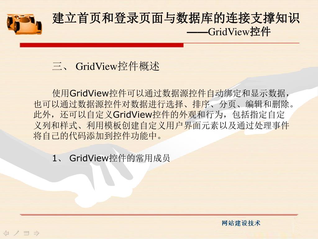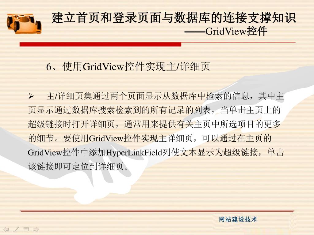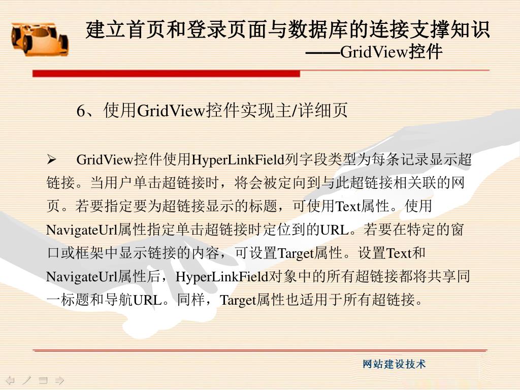建立首页和登录页面与数据库的连接支撑知识——GridView控件建立首页和登录页面与数据库的连接支撑知识——GridView控件 6、使用GridView控件实现主/详细页 • GridView控件使用HyperLinkField列字段类型为每条记录显示超链接。当用户单击超链接时,将会被定向到与此超链接相关联的网页。若要指定要为超链接显示的标题,可使用Text属性。使用NavigateUrl属性指定单击超链接时定位到的URL。若要在特定的窗口或框架中显示链接的内容,可设置Target属性。设置Text和NavigateUrl属性后,HyperLinkField对象中的所有超链接都将共享同一标题和导航URL。同样,Target属性也适用于所有超链接。