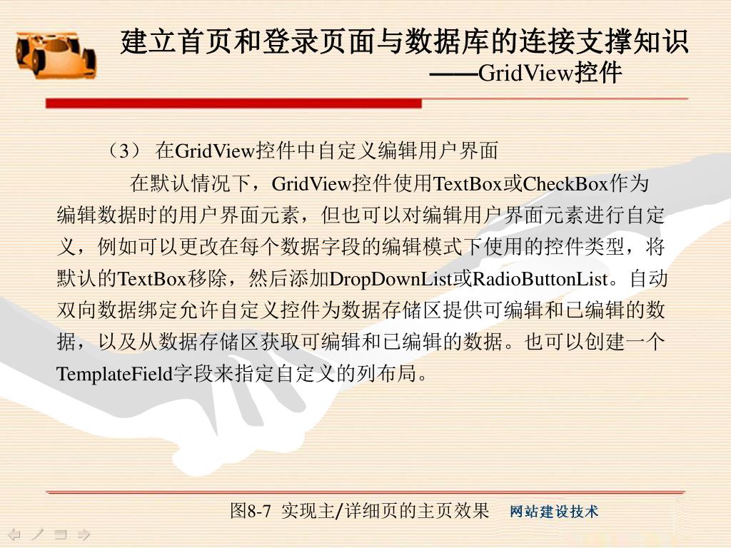 建立首页和登录页面与数据库的连接支撑知识——GridView控件建立首页和登录页面与数据库的连接支撑知识——GridView控件 7、使用GridView控件更新数据 (1) 启用内置编辑功能 在该控件的“GridView任务”菜单上,选中“启用编辑”复选框,或者将其AutoGenerateEditButton属性设置为True。 在GridView控件中添加一个CommandField字段,并将其ShowEditButton属性设置为True。 创建一个TemplateField字段,其中ItemTemplate模板包含多个命令按钮,若要进行更新,可将命令按钮的CommandName属性设置为Edit。 图8-7 实现主/详细页的主页效果