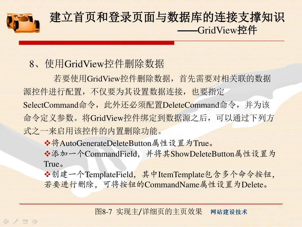 建立首页和登录页面与数据库的连接支撑知识——GridView控件建立首页和登录页面与数据库的连接支撑知识——GridView控件 8、使用GridView控件删除数据 若要使用GridView控件删除数据,首先需要对相关联的数据源控件进行配置,不仅要为其设置数据连接,也要指定SelectCommand命令,此外还必须配置DeleteCommand命令,并为该命令定义参数。将GridView控件绑定到数据源之后,可以通过下列方式之一来启用该控件的内置删除功能。 • 将AutoGenerateDeleteButton属性设置为True。 • 添加一个CommandField,并将其ShowDeleteButton属性设置为True。 • 创建一个TemplateField,其中ItemTemplate包含多个命令按钮,若要进行删除,可将按钮的CommandName属性设置为Delete。 图8-7 实现主/详细页的主页效果