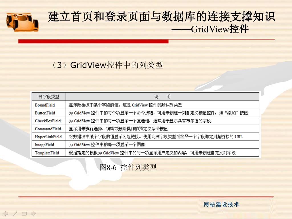 建立首页和登录页面与数据库的连接支撑知识——GridView控件建立首页和登录页面与数据库的连接支撑知识——GridView控件 (3)GridView控件中的列类型 图8-6 控件列类型