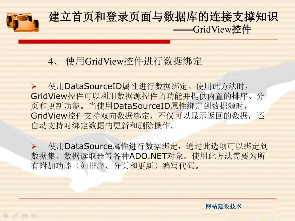 建立首页和登录页面与数据库的连接支撑知识——GridView控件建立首页和登录页面与数据库的连接支撑知识——GridView控件 4、 使用GridView控件进行数据绑定 • 使用DataSourceID属性进行数据绑定。使用此方法时,GridView控件可以利用数据源控件的功能并提供内置的排序、分页和更新功能。当使用DataSourceID属性绑定到数据源时,GridView控件支持双向数据绑定,不仅可以显示返回的数据,还自动支持对绑定数据的更新和删除操作。 • 使用DataSource属性进行数据绑定,通过此选项可以绑定到数据集、数据读取器等各种ADO.NET对象。使用此方法需要为所有附加功能(如排序、分页和更新)编写代码。