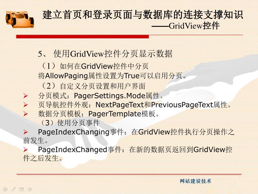 建立首页和登录页面与数据库的连接支撑知识——GridView控件建立首页和登录页面与数据库的连接支撑知识——GridView控件 5、 使用GridView控件分页显示数据 (1)如何在GridView控件中分页 将AllowPaging属性设置为True可以启用分页。 (2)自定义分页设置和用户界面 • 分页模式:PagerSettings.Mode属性。 • 页导航控件外观:NextPageText和PreviousPageText属性。 • 数据分页模板:PagerTemplate模板。 (3)使用分页事件 • PageIndexChanging事件:在GridView控件执行分页操作之前发生。 • PageIndexChanged事件:在新的数据页返回到GridView控件之后发生。
