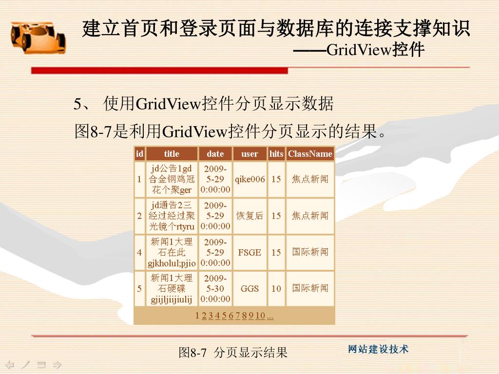 建立首页和登录页面与数据库的连接支撑知识——GridView控件建立首页和登录页面与数据库的连接支撑知识——GridView控件 5、 使用GridView控件分页显示数据 图8-7是利用GridView控件分页显示的结果。 图8-7 分页显示结果