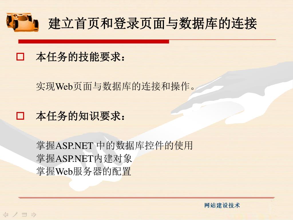 建立首页和登录页面与数据库的连接 • 本任务的技能要求: 实现Web页面与数据库的连接和操作。 • 本任务的知识要求: 掌握ASP.NET 中的数据库控件的使用 掌握ASP.NET内建对象 掌握Web服务器的配置