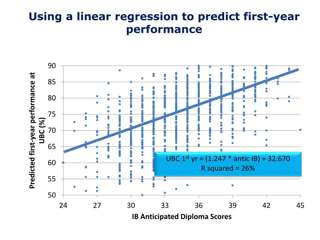 Using a linear regression to predict first-year performance UBC 1st yr = (1.247 * antic IB) + 32.670 R squared = 26%