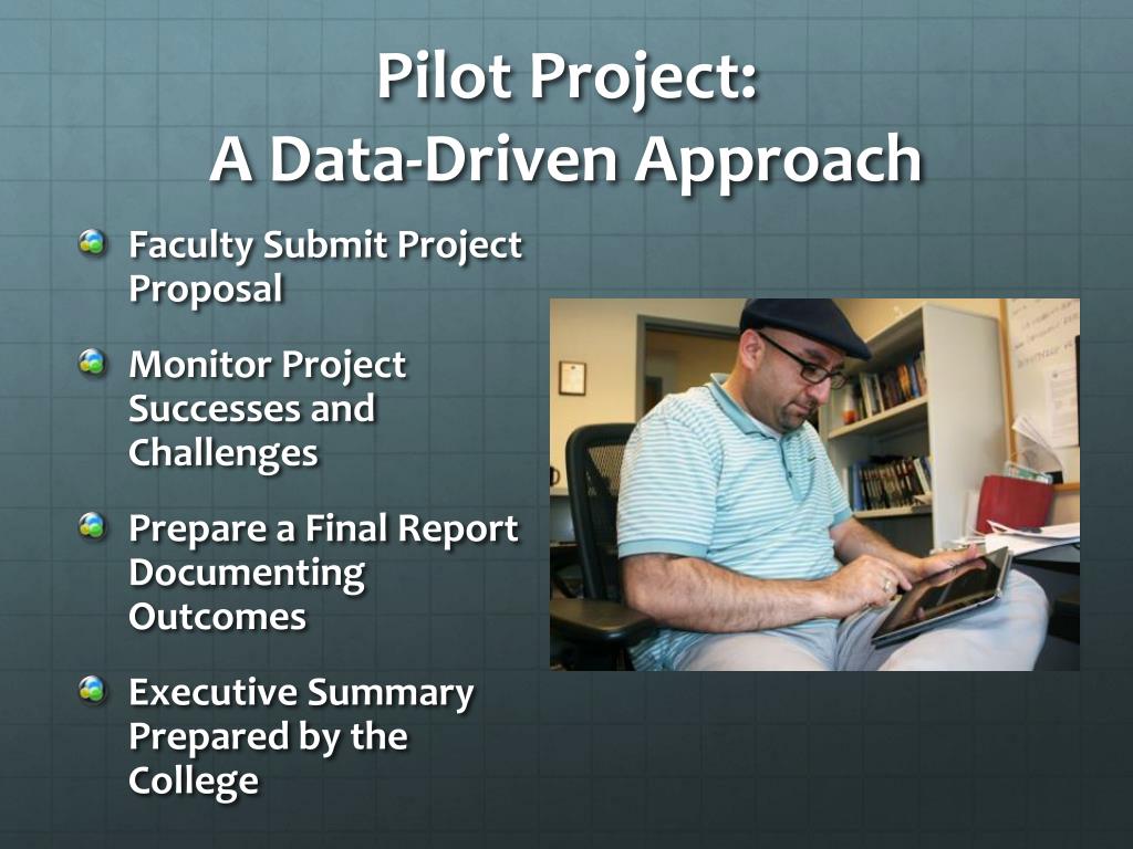 Pilot Project: A Data-Driven Approach • Faculty Submit Project Proposal • Monitor Project Successes and Challenges • Prepare a Final Report Documenting Outcomes • Executive Summary Prepared by the College
