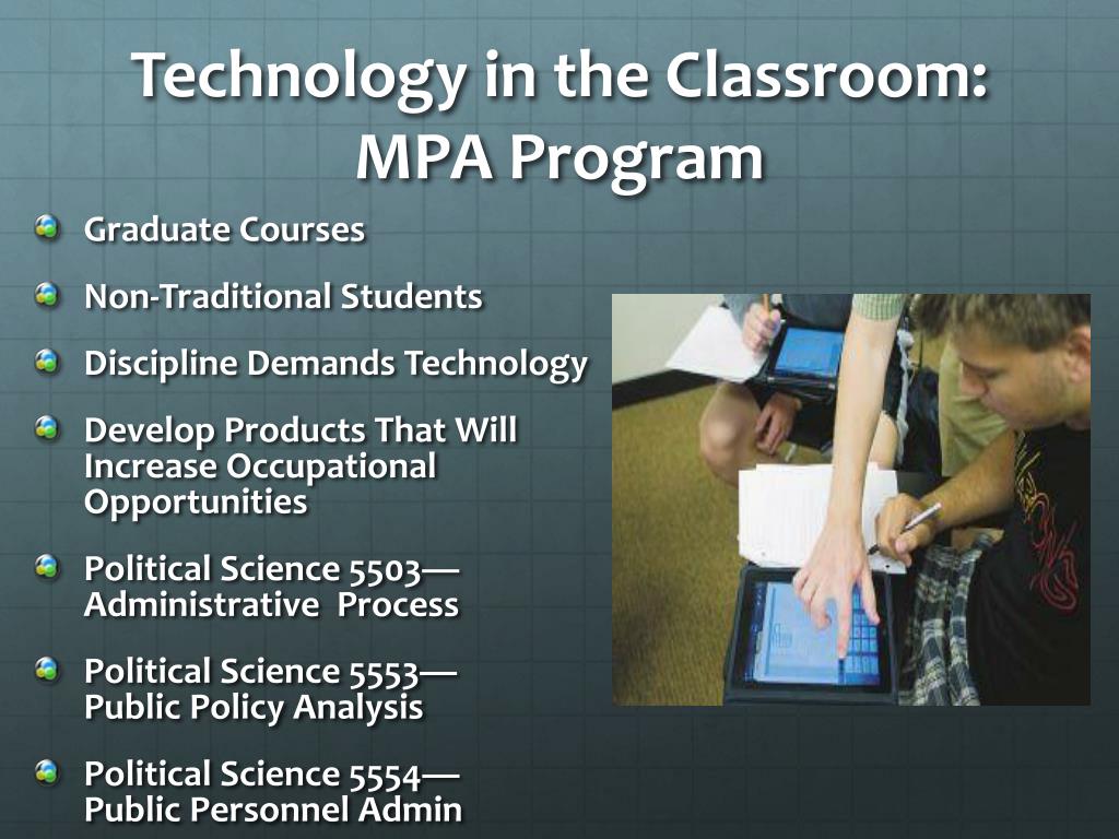 Technology in the Classroom: MPA Program • Graduate Courses • Non-Traditional Students • Discipline Demands Technology • Develop Products That Will Increase Occupational Opportunities • Political Science 5503—Administrative Process • Political Science 5553— Public Policy Analysis • Political Science 5554— Public Personnel Admin