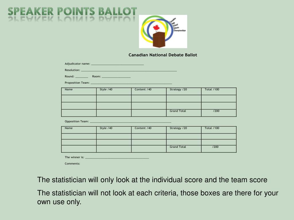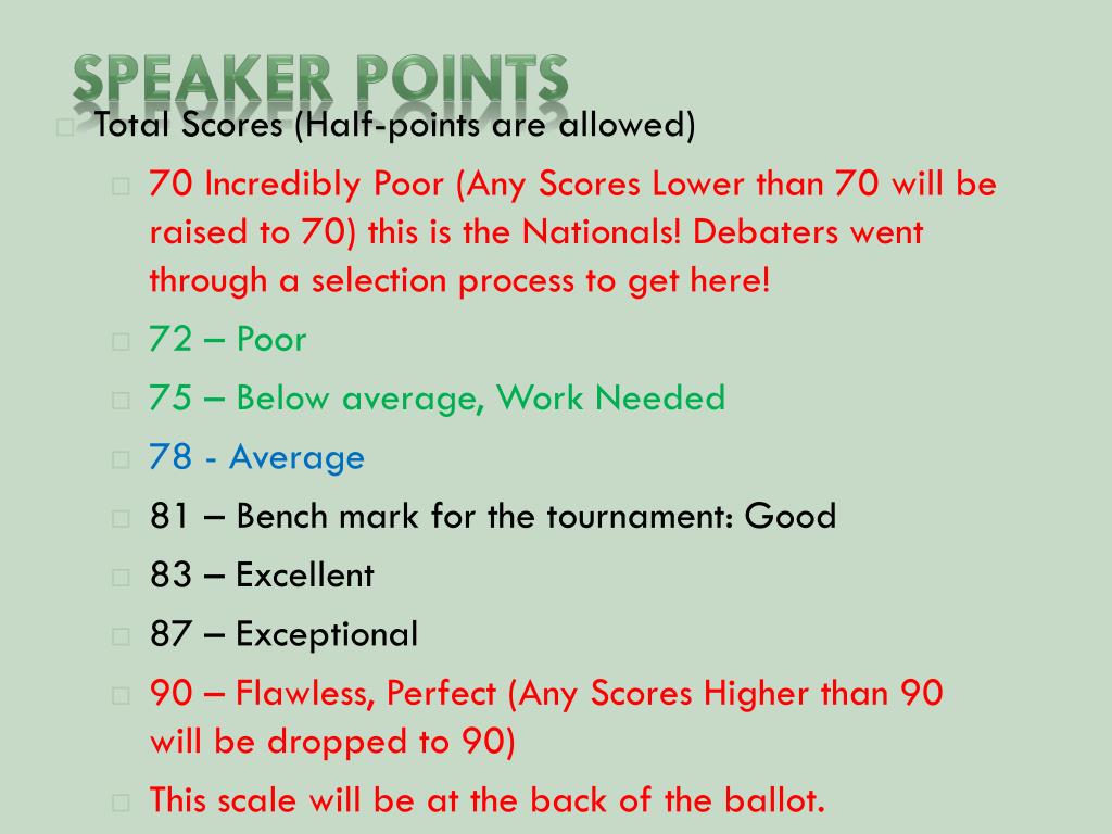 Speaker Points • Total Scores (Half-points are allowed) • 70 Incredibly Poor (Any Scores Lower than 70 will be raised to 70) this is the Nationals! Debaters went through a selection process to get here! • 72 – Poor • 75 – Below average, Work Needed • 78 - Average • 81 – Bench mark for the tournament: Good • 83 – Excellent • 87 – Exceptional • 90 – Flawless, Perfect (Any Scores Higher than 90 will be dropped to 90) • This scale will be at the back of the ballot.