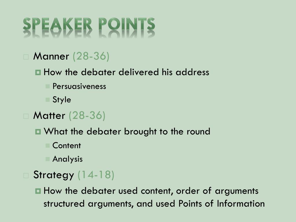 Speaker Points • Manner (28-36) • How the debater delivered his address • Persuasiveness • Style • Matter (28-36) • What the debater brought to the round • Content • Analysis • Strategy (14-18) • How the debater used content, order of arguments structured arguments, and used Points of Information