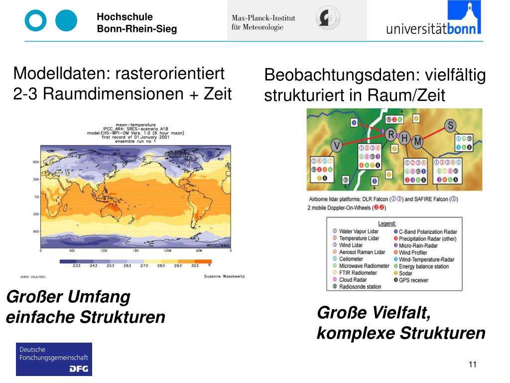 Modelldaten: rasterorientiert 2-3 Raumdimensionen + Zeit Beobachtungsdaten: vielfältig strukturiert in Raum/Zeit Großer Umfang einfache Strukturen Große Vielfalt, komplexe Strukturen