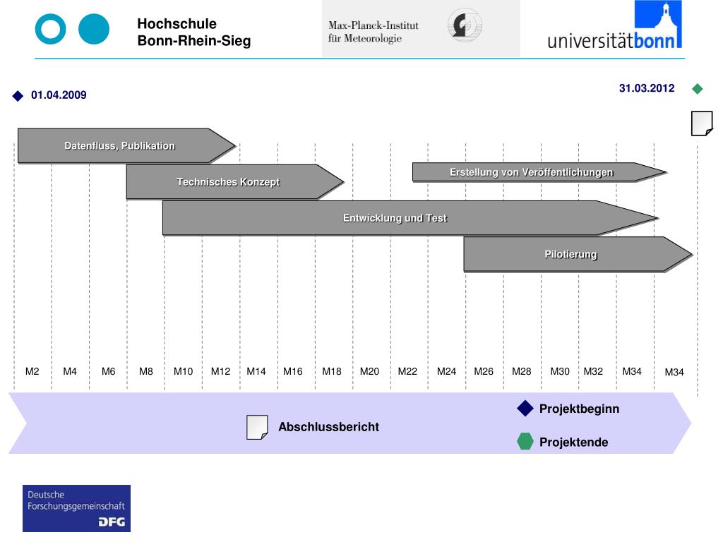 31.03.2012 01.04.2009 Datenfluss, Publikation Erstellung von Veröffentlichungen Technisches Konzept Entwicklung und Test Pilotierung M2 M4 M6 M8 M10 M12 M14 M16 M18 M20 M22 M24 M26 M28 M30 M32 M34 M34 Projektbeginn Abschlussbericht Projektende