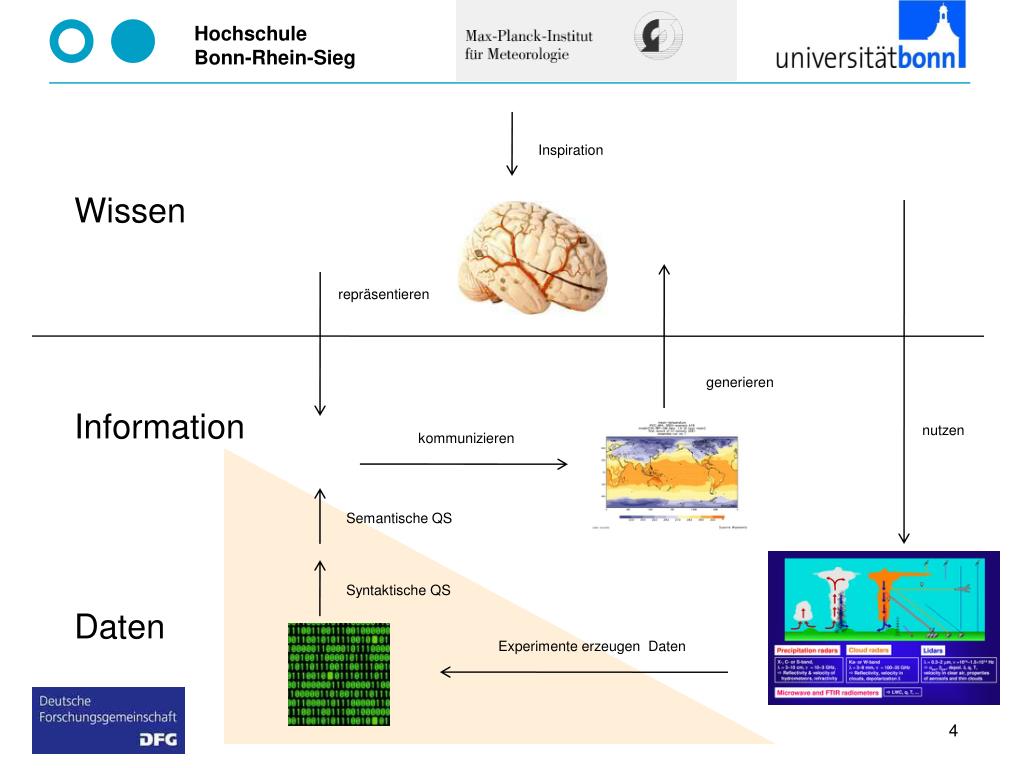 Inspiration Wissen repräsentieren generieren Information nutzen kommunizieren Semantische QS Syntaktische QS Daten Experimente erzeugen Daten
