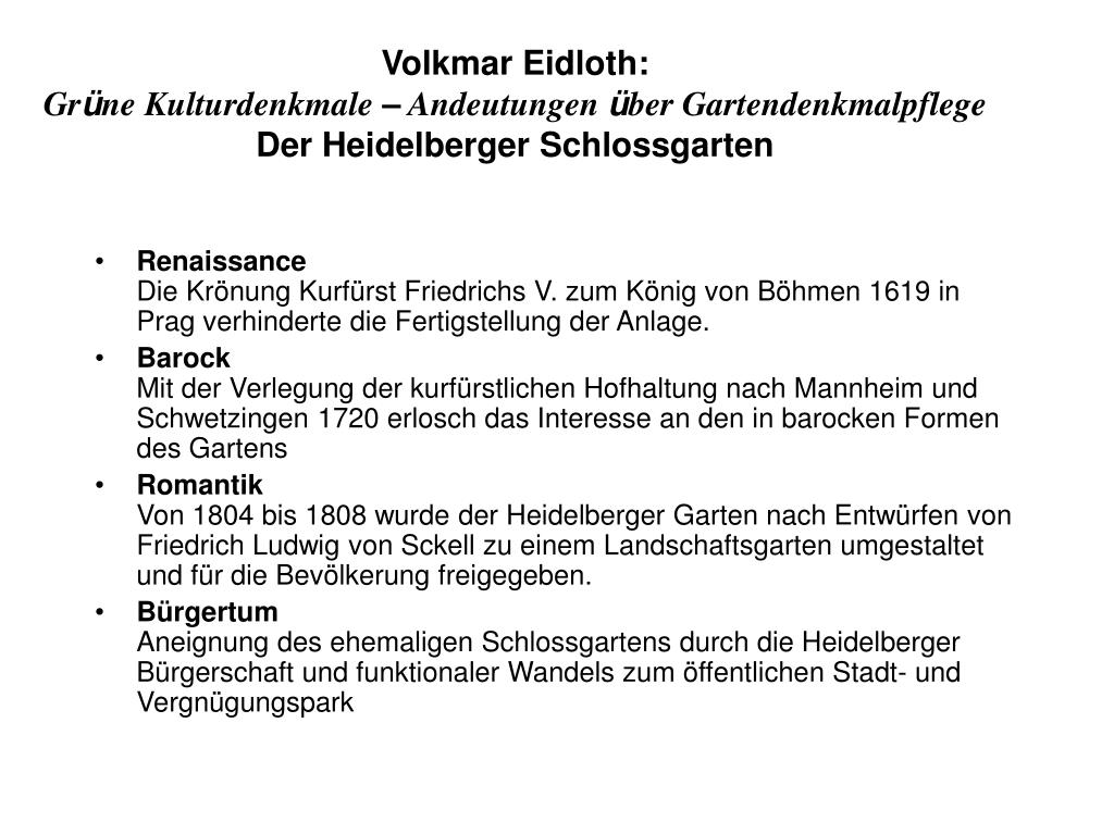 Volkmar Eidloth: Grüne Kulturdenkmale – Andeutungen über GartendenkmalpflegeDer Heidelberger Schlossgarten • RenaissanceDie Krönung Kurfürst Friedrichs V. zum König von Böhmen 1619 in Prag verhinderte die Fertigstellung der Anlage. • BarockMit der Verlegung der kurfürstlichen Hofhaltung nach Mannheim und Schwetzingen 1720 erlosch das Interesse an den in barocken Formen des Gartens • RomantikVon 1804 bis 1808 wurde der Heidelberger Garten nach Entwürfen von Friedrich Ludwig von Sckell zu einem Landschaftsgarten umgestaltet und für die Bevölkerung freigegeben. • BürgertumAneignung des ehemaligen Schlossgartens durch die Heidelberger Bürgerschaft und funktionaler Wandels zum öffentlichen Stadt- und Vergnügungspark
