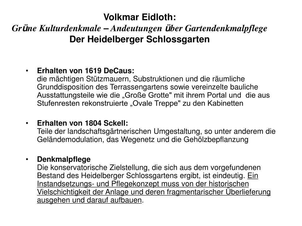 Volkmar Eidloth: Grüne Kulturdenkmale – Andeutungen über GartendenkmalpflegeDer Heidelberger Schlossgarten • Erhalten von 1619 DeCaus:die mächtigen Stützmauern, Substruktionen und die räumliche Grunddisposition des Terrassengartens sowie vereinzelte bauliche Ausstattungsteile wie die „Große Grotte" mit ihrem Portal und die aus Stufenresten rekonstruierte „Ovale Treppe" zu den Kabinetten • Erhalten von 1804 Sckell:Teile der landschaftsgärtnerischen Umgestaltung, so unter anderem die Geländemodulation, das Wegenetz und die Gehölzbepflanzung • DenkmalpflegeDie konservatorische Zielstellung, die sich aus dem vorgefundenen Bestand des HeidelbergerSchlossgartens ergibt, ist eindeutig. Ein Instandsetzungs- und Pflegekonzept muss von der historischen Vielschichtigkeit der Anlage und deren fragmentarischer Überlieferung ausgehen und darauf aufbauen.