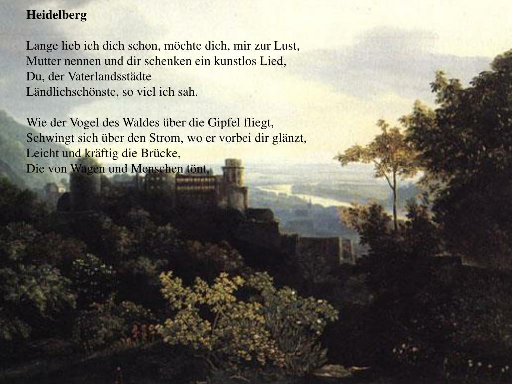 Heidelberg Lange lieb ich dich schon, möchte dich, mir zur Lust, Mutter nennen und dir schenken ein kunstlos Lied, Du, der Vaterlandsstädte Ländlichschönste, so viel ich sah. Wie der Vogel des Waldes über die Gipfel fliegt, Schwingt sich über den Strom, wo er vorbei dir glänzt, Leicht und kräftig die Brücke, Die von Wagen und Menschen tönt.