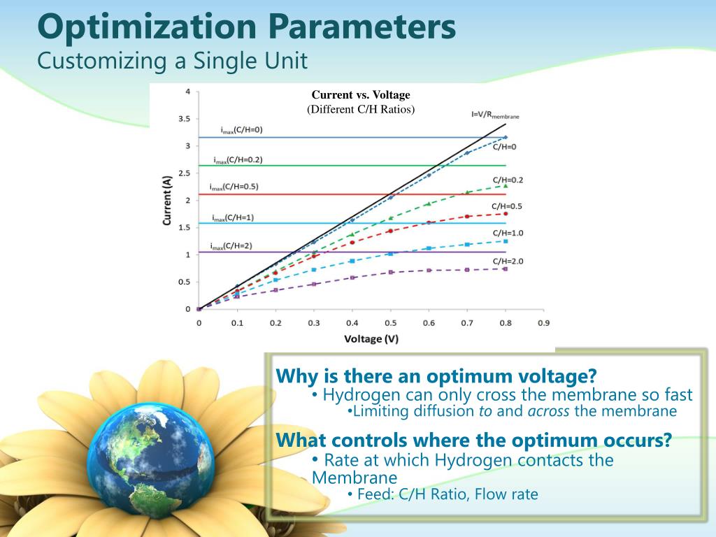 Optimization Parameters Customizing a Single Unit Current vs. Voltage (Different C/H Ratios) • Why is there an optimum voltage? • Hydrogen can only cross the membrane so fast • Limiting diffusion to and across the membrane • What controls where the optimum occurs? • Rate at which Hydrogen contacts the Membrane • Feed: C/H Ratio, Flow rate