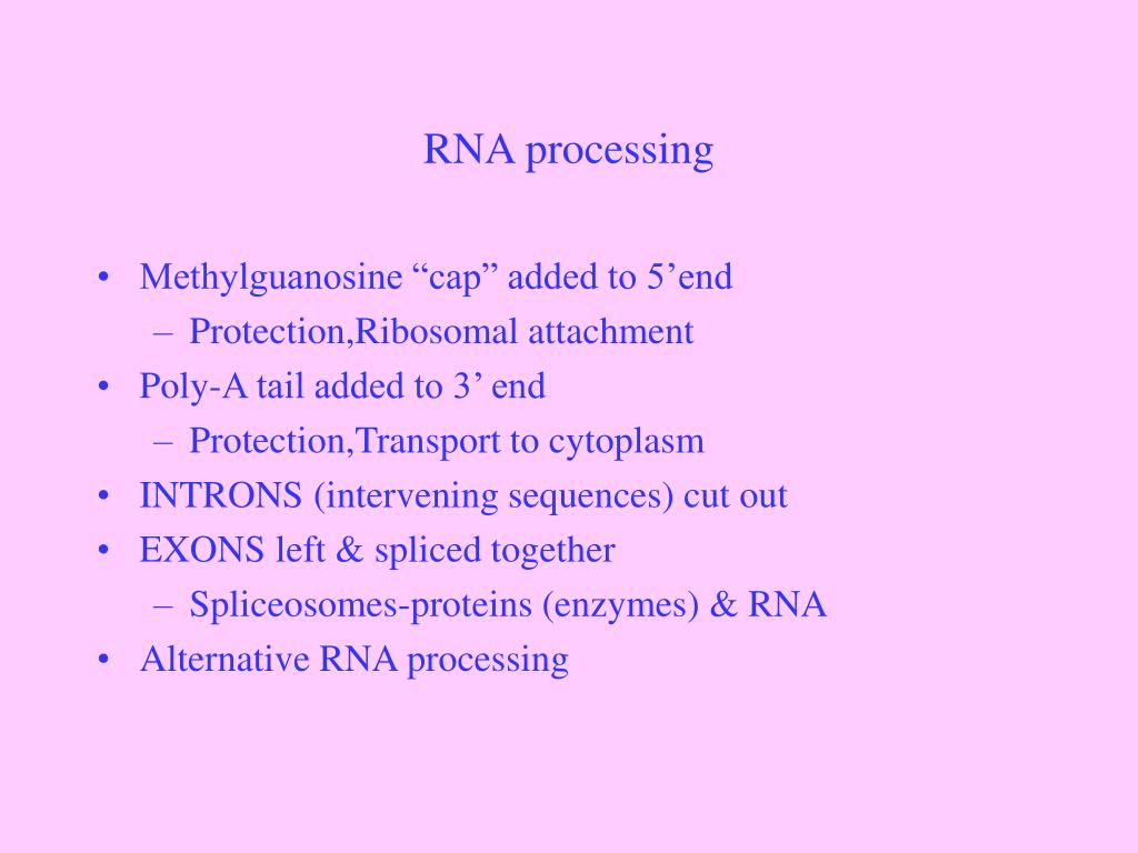 RNA processing • Methylguanosine “cap” added to 5’end • Protection,Ribosomal attachment • Poly-A tail added to 3’ end • Protection,Transport to cytoplasm • INTRONS (intervening sequences) cut out • EXONS left & spliced together • Spliceosomes-proteins (enzymes) & RNA • Alternative RNA processing