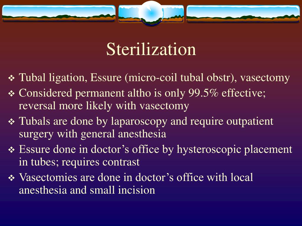 Sterilization • Tubal ligation, Essure (micro-coil tubal obstr), vasectomy • Considered permanent altho is only 99.5% effective; reversal more likely with vasectomy • Tubals are done by laparoscopy and require outpatient surgery with general anesthesia • Essure done in doctor’s office by hysteroscopic placement in tubes; requires contrast • Vasectomies are done in doctor’s office with local anesthesia and small incision