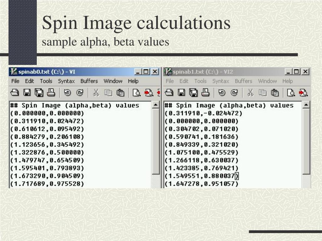 Spin Image Applicationkeyboard commands Left/right arrow – rotate along y axis Up/down arrow – rotate along x axis PgUp/PgDn – rotate along z axis -/= zoom-out / zoom-in Home/end – select next/previous vertex