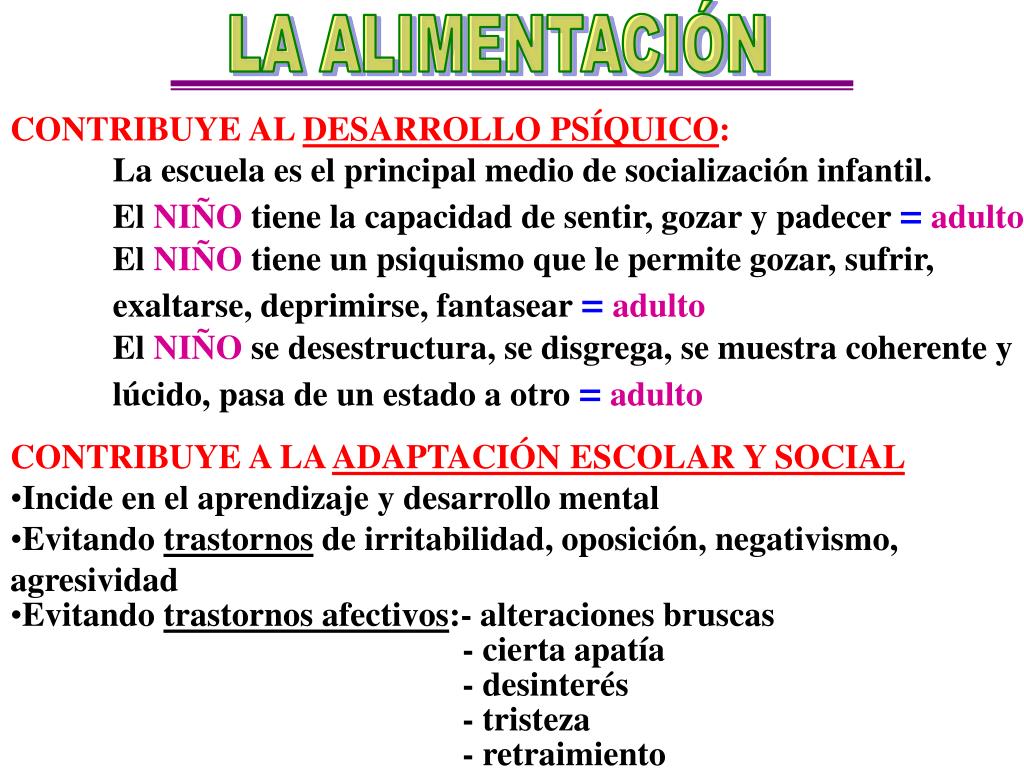 LA ALIMENTACIÓN • CONTRIBUYE AL DESARROLLO PSÍQUICO: • La escuela es el principal medio de socialización infantil. • El NIÑO tiene la capacidad de sentir, gozar y padecer =adulto • El NIÑO tiene un psiquismo que le permite gozar, sufrir, exaltarse, deprimirse, fantasear =adulto • El NIÑO se desestructura, se disgrega, se muestra coherente y lúcido, pasa de un estado a otro =adulto • CONTRIBUYE A LA ADAPTACIÓN ESCOLAR Y SOCIAL • Incide en el aprendizaje y desarrollo mental • Evitando trastornos de irritabilidad, oposición, negativismo, agresividad • Evitando trastornos afectivos:- alteraciones bruscas • - cierta apatía • - desinterés • - tristeza • - retraimiento