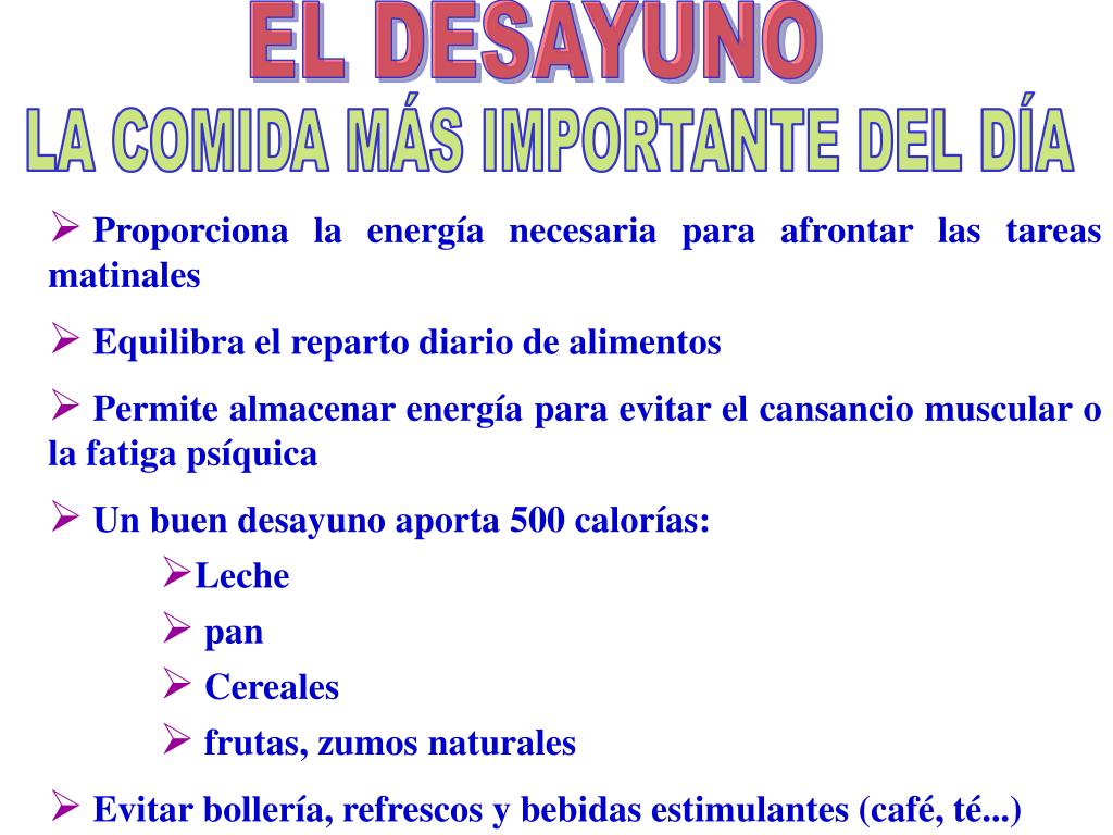 EL DESAYUNO LA COMIDA MÁS IMPORTANTE DEL DÍA • Proporciona la energía necesaria para afrontar las tareas matinales • Equilibra el reparto diario de alimentos • Permite almacenar energía para evitar el cansancio muscular o la fatiga psíquica • Un buen desayuno aporta 500 calorías: • Leche • pan • Cereales • frutas, zumos naturales • Evitar bollería, refrescos y bebidas estimulantes (café, té...)