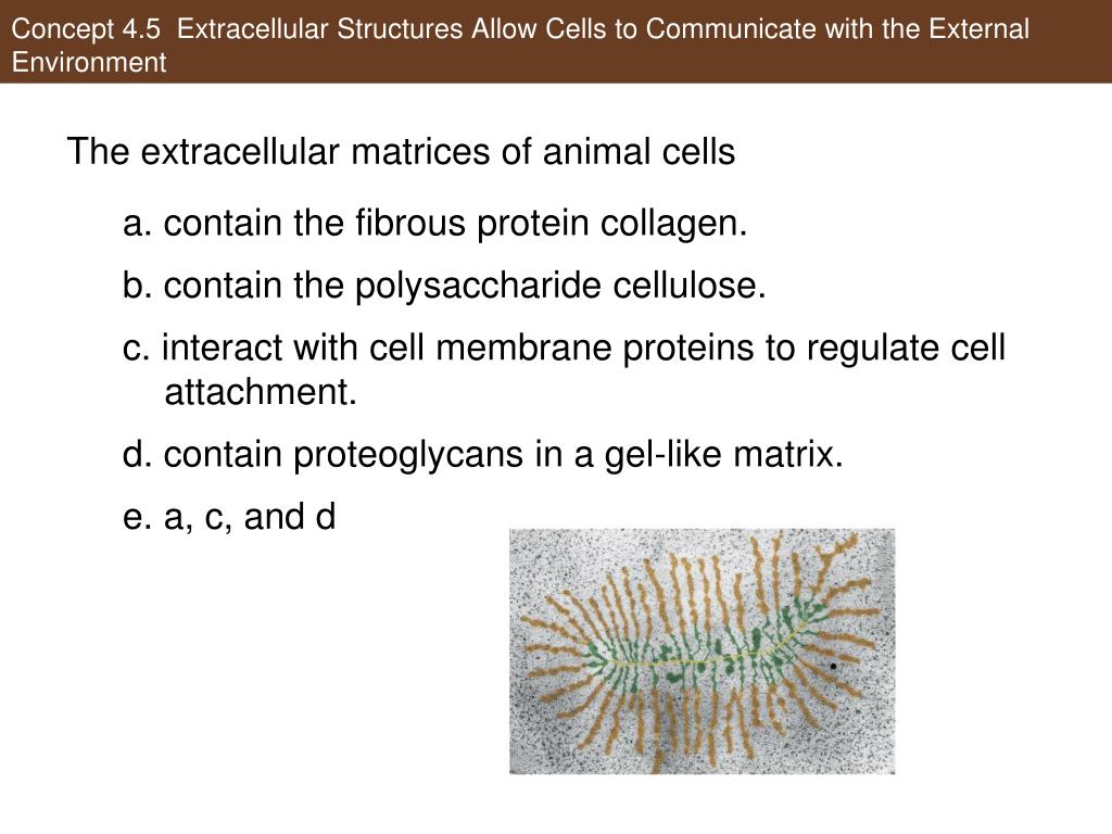 Concept 4.5 Extracellular Structures Allow Cells to Communicate with the External Environment The extracellular matrices of animal cells a. contain the fibrous protein collagen. b. contain the polysaccharide cellulose. c. interact with cell membrane proteins to regulate cell attachment. d. contain proteoglycans in a gel-like matrix. e. a, c, and d