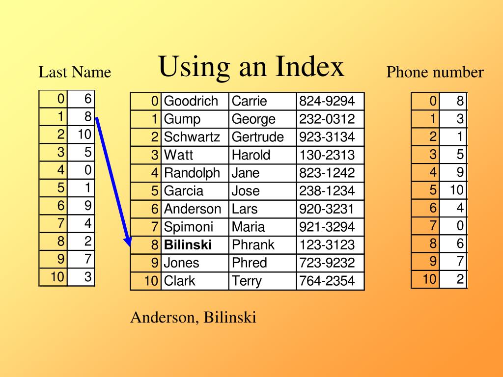 Phone number Last Name Using an Index Anderson, Bilinski, Clark