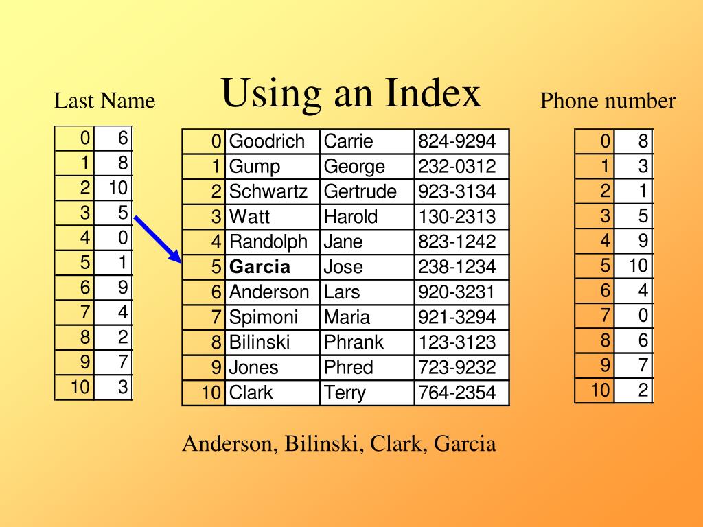 Phone number Last Name Using an Index Anderson, Bilinski, Clark, Garcia
