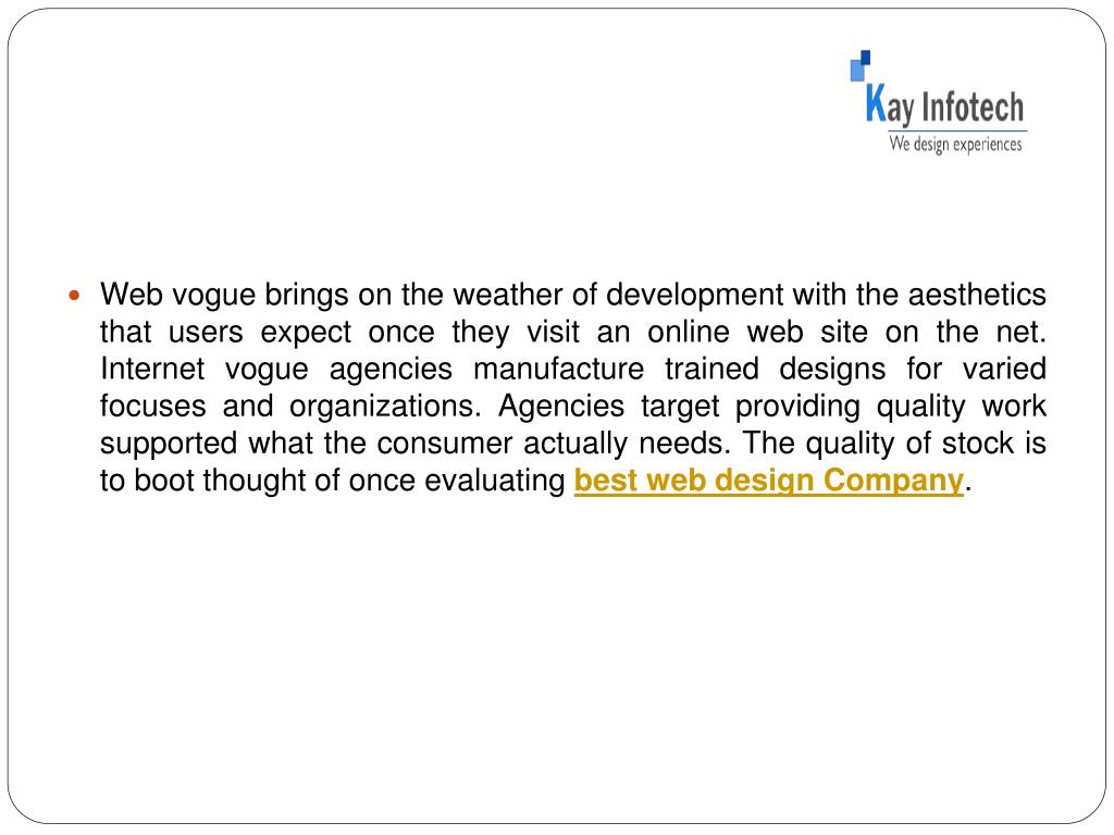 Web vogue brings on the weather of development with the aesthetics that users expect once they visit an online web site on the net. Internet vogue agencies manufacture trained designs for varied focuses and organizations. Agencies target providing quality work supported what the consumer actually needs. The quality of stock is to boot thought of once evaluating best web design Company.