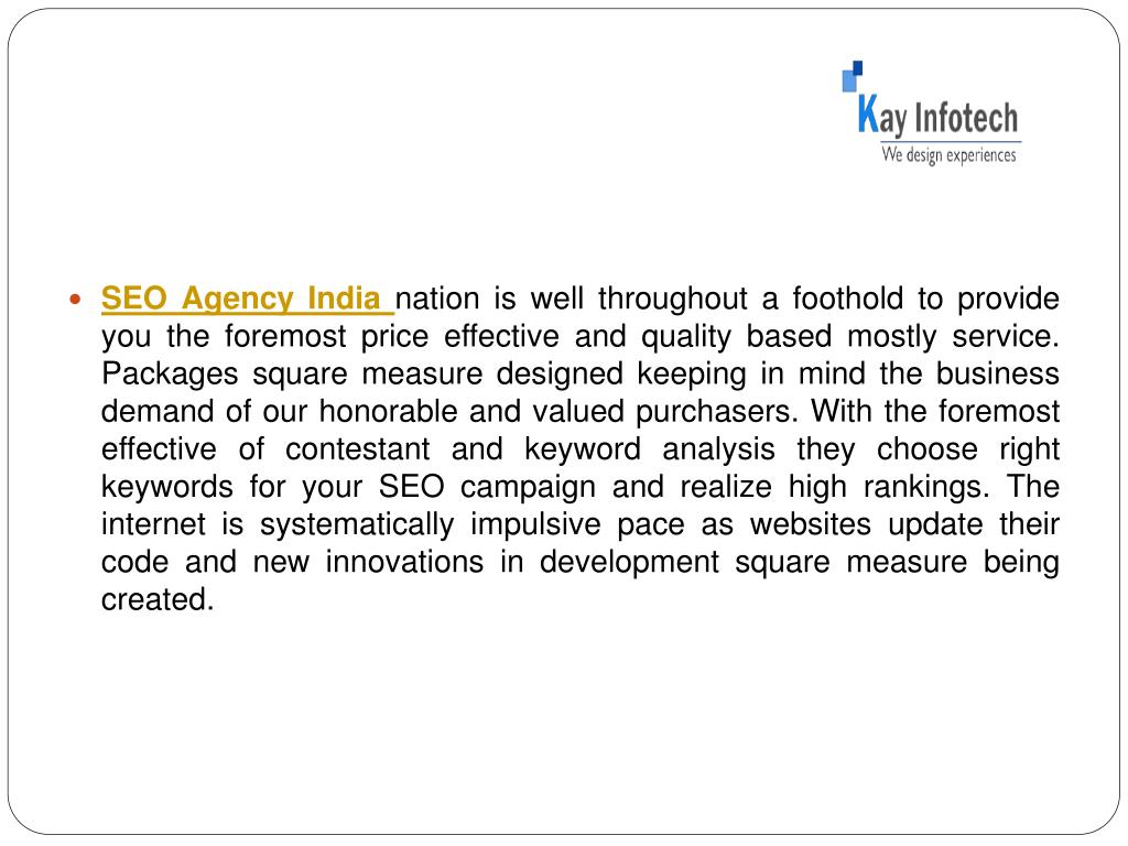 SEO Agency India nation is well throughout a foothold to provide you the foremost price effective and quality based mostly service. Packages square measure designed keeping in mind the business demand of our honorable and valued purchasers.