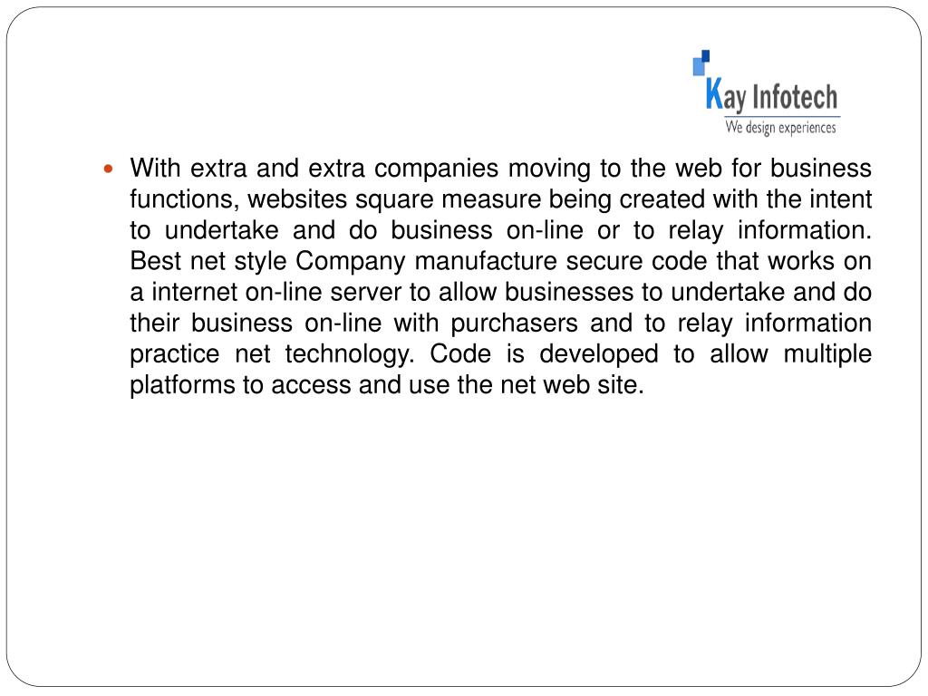 With extra and extra companies moving to the web for business functions, websites square measure being created with the intent to undertake and do business on-line or to relay information. Best net style Company manufacture secure code that works on a internet on-line server to allow businesses to undertake and do their business on-line with purchasers and to relay information practice net technology. Code is developed to allow multiple platforms to access and use the net web site.