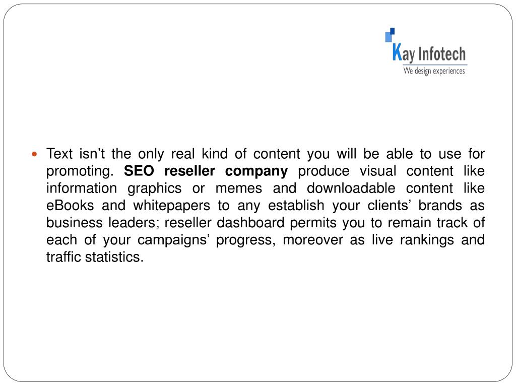 Text isn’t the only real kind of content you will be able to use for promoting. SEO reseller company produce visual content like information graphics or memes and downloadable content like eBooks and whitepapers to any establish your clients’ brands as business leaders; reseller dashboard permits you to remain track of each of your campaigns’ progress, moreover as live rankings and traffic statistics.