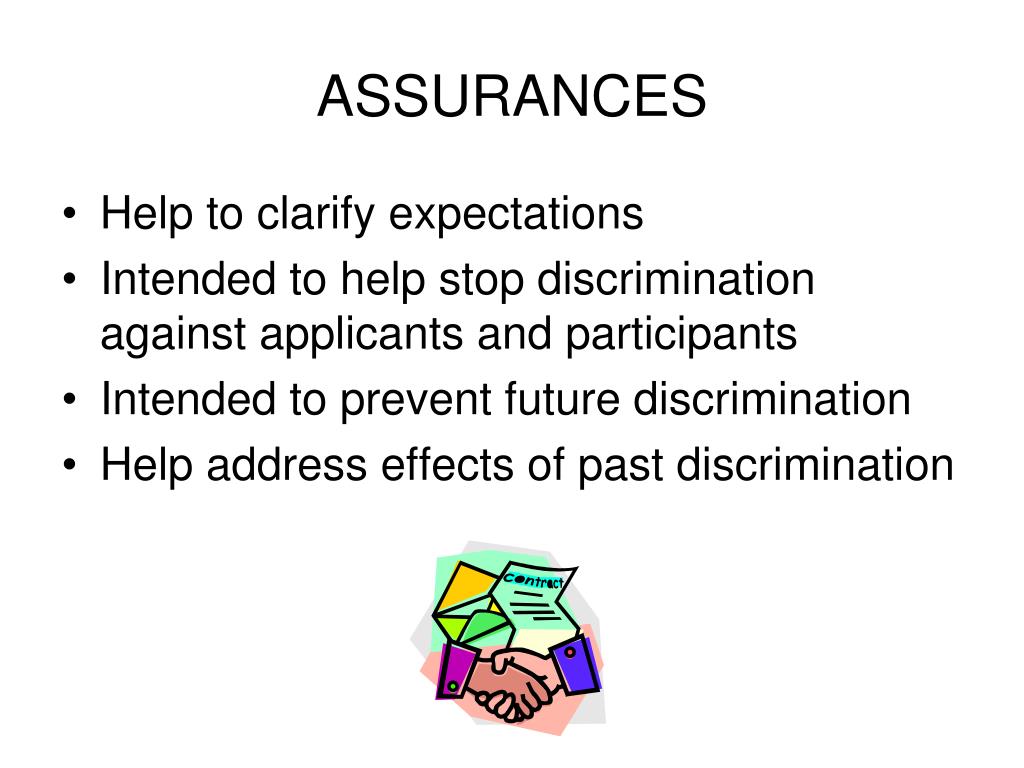 ASSURANCES • Help to clarify expectations • Intended to help stop discrimination against applicants and participants • Intended to prevent future discrimination • Help address effects of past discrimination