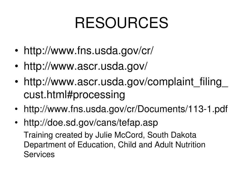 RESOURCES • http://www.fns.usda.gov/cr/ • http://www.ascr.usda.gov/ • http://www.ascr.usda.gov/complaint_filing_cust.html#processing • http://www.fns.usda.gov/cr/Documents/113-1.pdf • http://doe.sd.gov/cans/tefap.asp Training created by Julie McCord, South Dakota Department of Education, Child and Adult Nutrition Services