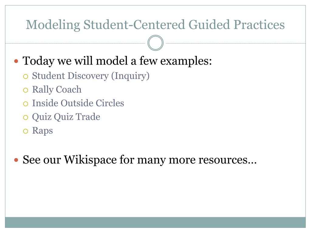 Modeling Student-Centered Guided Practices • Today we will model a few examples: • Student Discovery (Inquiry) • Rally Coach • Inside Outside Circles • Quiz Quiz Trade • Raps • See our Wikispace for many more resources…