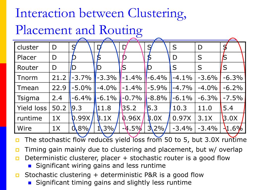 Interaction between Clustering, Placement and Routing • The stochastic flow reduces yield loss from 50 to 5, but 3.0X runtime • Timing gain mainly due to clustering and placement, but w/ overlap • Deterministic clusterer, placer + stochastic router is a good flow • Significant wiring gains and less runtime • Stochastic clustering + deterministic P&R is a good flow • Significant timing gains and slightly less runtime