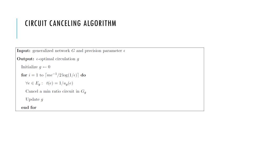 Circulation Decomposition • A circuit is a circulation that sends flow only along the arcs of a single unit-gain cycle or bicycle • Decomposition Lemma (without proof): • A generalized circulation g can be decomposed into components such that and each component is a circuit that is positive only on arcs with • Optimality Condition (without proof): • optimal --- no negative cost residual unit-gain cycles or bicycles