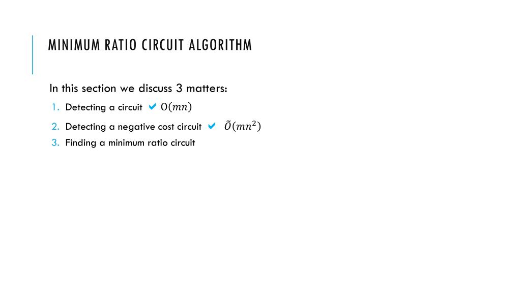 Minimum Ratio Circuit Algorithm • In this section we discuss 3 matters: • Detecting a circuit • Detecting a negative cost circuit • Finding a minimum ratio circuit