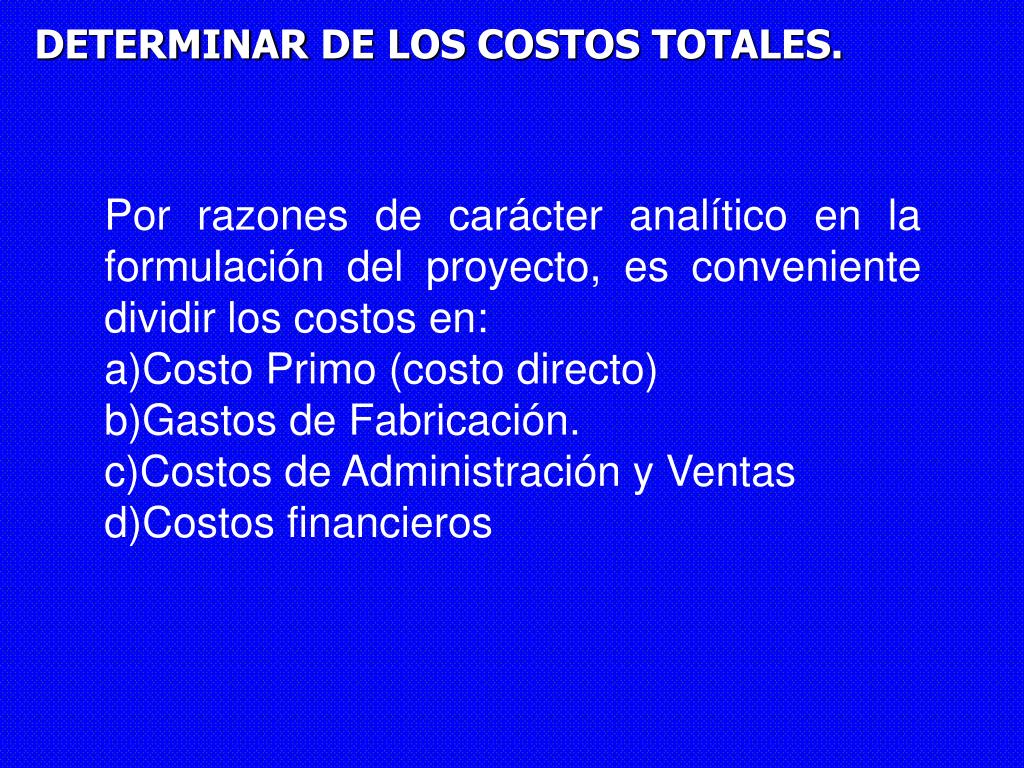 DETERMINAR DE LOS COSTOS TOTALES. • Por razones de carácter analítico en la formulación del proyecto, es conveniente dividir los costos en: • Costo Primo (costo directo) • Gastos de Fabricación. • Costos de Administración y Ventas • Costos financieros