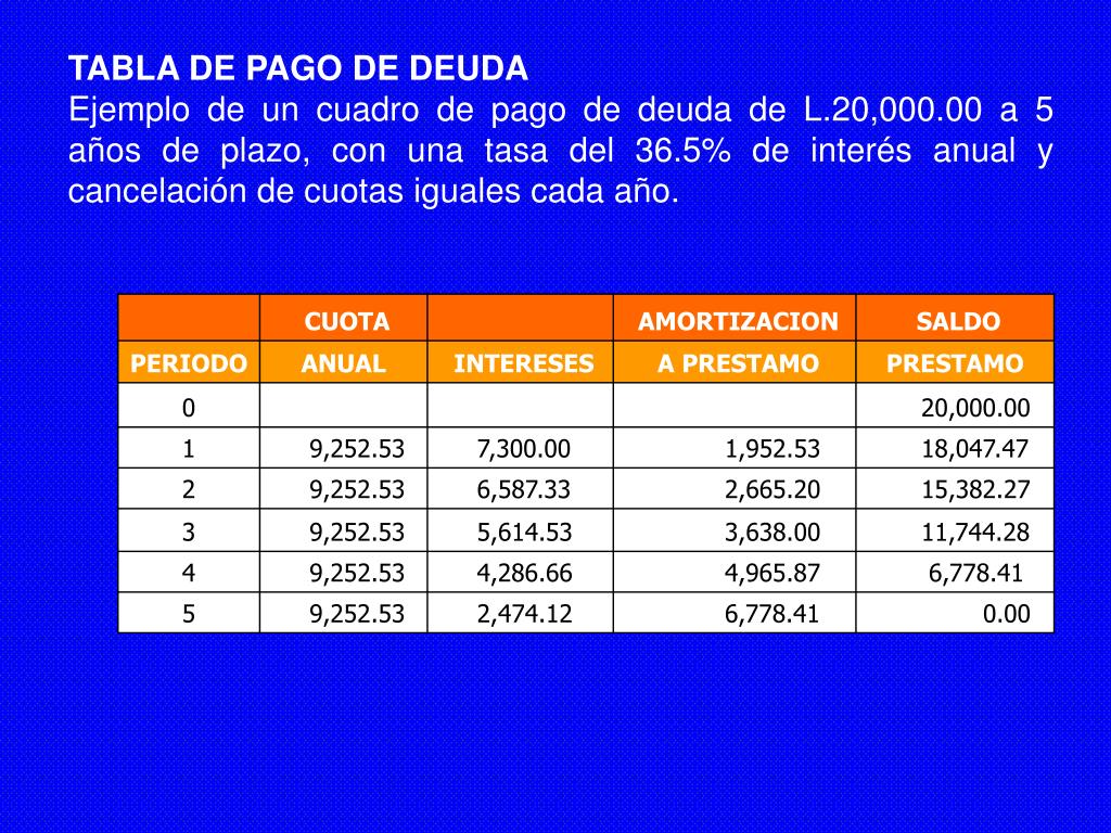 TABLA DE PAGO DE DEUDA Ejemplo de un cuadro de pago de deuda de L.20,000.00 a 5 años de plazo, con una tasa del 36.5% de interés anual y cancelación de cuotas iguales cada año.
