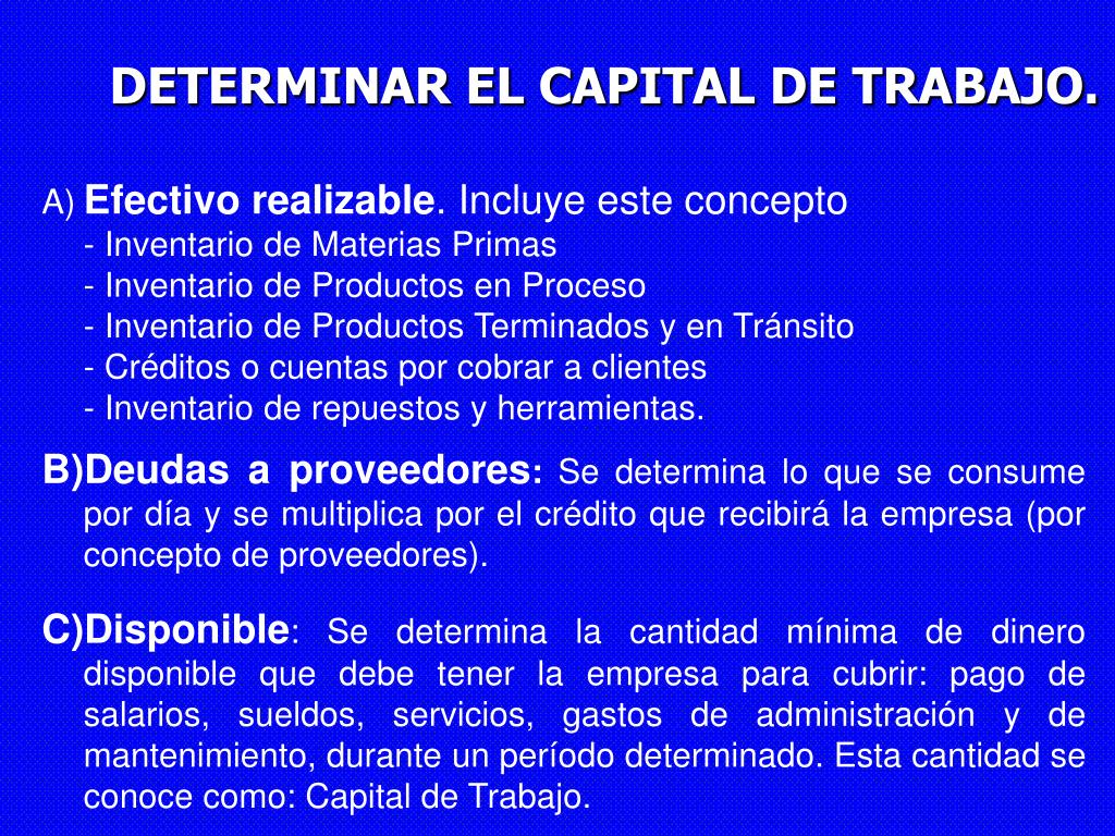 DETERMINAR EL CAPITAL DE TRABAJO. • A) Efectivo realizable. Incluye este concepto • - Inventario de Materias Primas • - Inventario de Productos en Proceso • - Inventario de Productos Terminados y en Tránsito • - Créditos o cuentas por cobrar a clientes • - Inventario de repuestos y herramientas. • Deudas a proveedores: Se determina lo que se consume por día y se multiplica por el crédito que recibirá la empresa (por concepto de proveedores). • Disponible: Se determina la cantidad mínima de dinero disponible que debe tener la empresa para cubrir: pago de salarios, sueldos, servicios, gastos de administración y de mantenimiento, durante un período determinado. Esta cantidad se conoce como: Capital de Trabajo.