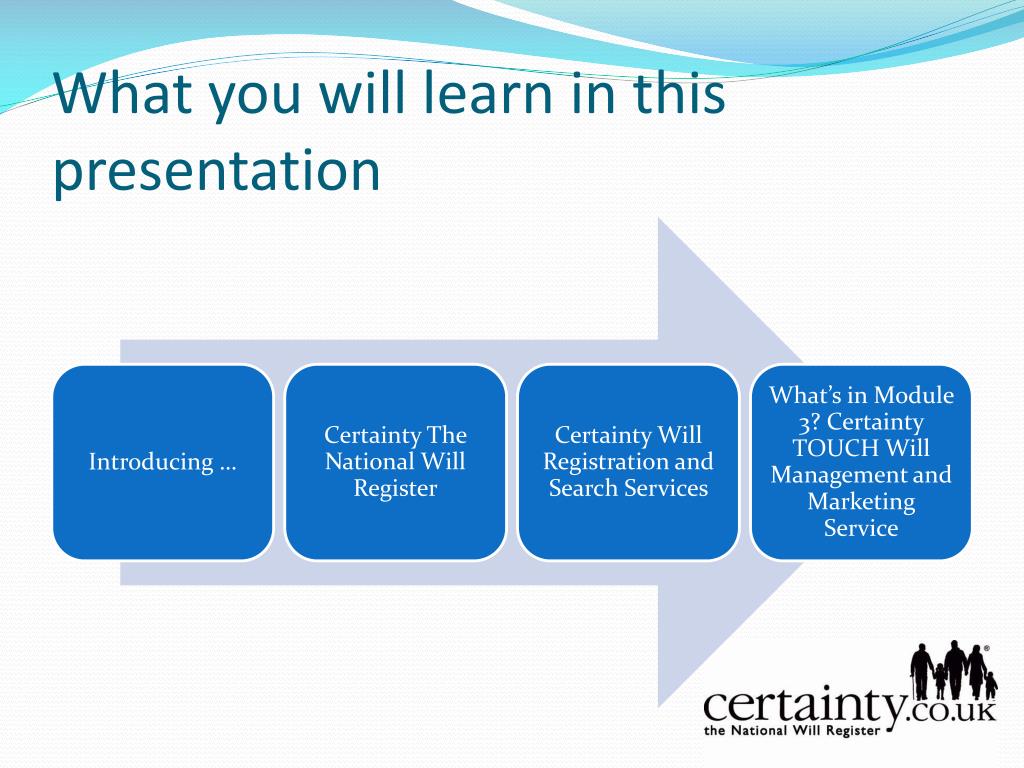 Certainty The National Will Register. Will Search - Reducing Risk During Estate Distribution. What you will learn in this presentation. Certainty Works All Round. Refresher - The top 6 reasons to register your clients Wills.